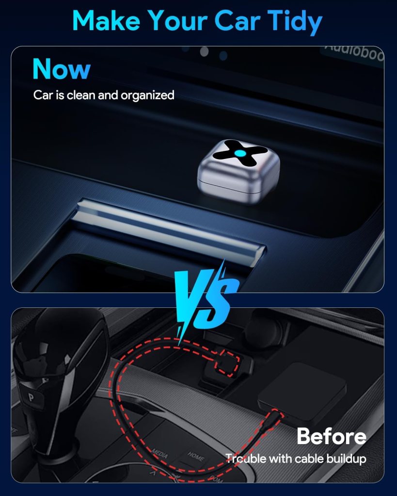 - ใ Ultimate Smarter and Simple Driving ใUpgrade to the newest apple car play that flawlessly converts wired CarPlay to wireless. This wireless android auto supports full navigation, music streaming, hands-free calls, and smart voice assistant. Enjoy voice, button and steering wheel, triple-control methods for a safer, smarter drive. Designed for both iPhone and Android users, making every ride simple, fast, and completely wireless.