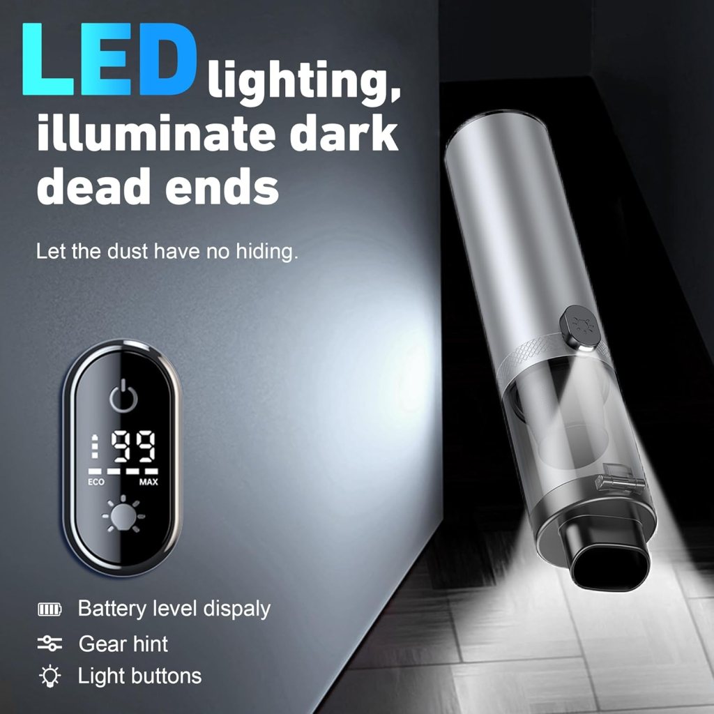 - Ultra-lightweight & LED Display: Water bottle shaped, light and easy to carry, this car vacuum weighs only 1.1 pounds, less than a bottle of Coke, cordless design and type-c fast charge for easy use in the car. The unique LED display design can clearly see the remaining power and the current gear, so that you can better arrange your cleaning plan