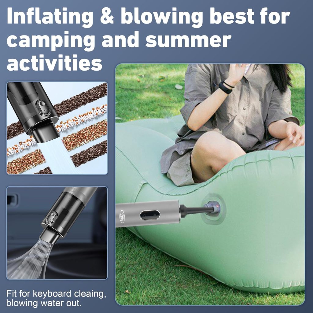- 4-in-1 Multi-function: Vacuuming, inflating, dusting, and pumping in one design. In addition to the accessories given that can help you vacuum in multiple scerios, There is also an air nozzle that can be used for most small-large sized inflatable products, such as air mattresses, inflatable beds, pool floats, sleeping pads, swim rings, inflatable furniture, pool inflatables and other inflatable toys