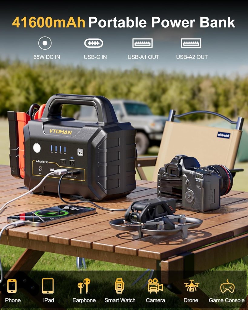 • 65W Fast Charging & Large Capacity – The V-Truck Pro portable car jump starter power bank supports 65W fast charging, fully charging its massive 41600mAh battery in just 2.5 hours. Its large capacity allows it to charge a smartphone approximately 8-10 times, also can powers tablets, cameras, and other USB devices. Whether it’s a truck driver’s long transport route or a family’s weekend camping trip, it’s an ideal choice for emergencies and outdoor travel
