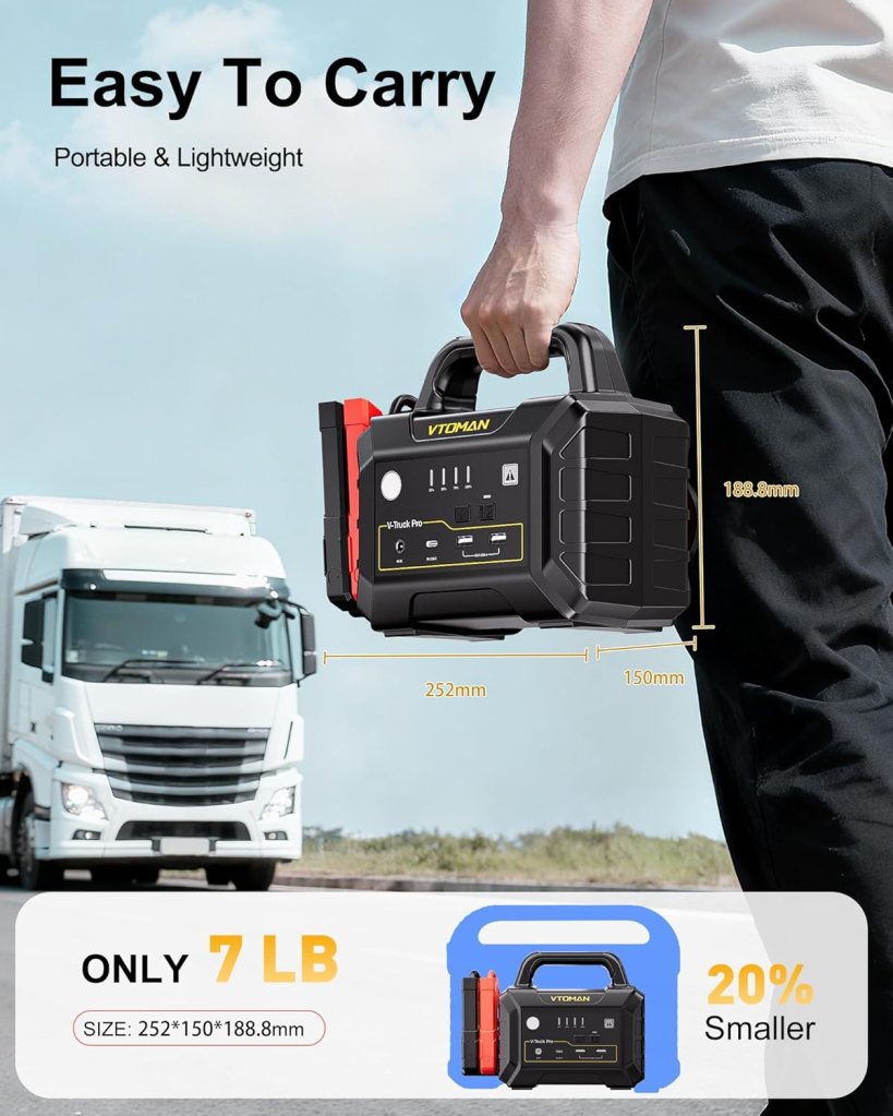 • 8000A Heavy-Duty Truck Savior – Delivering 8000A peak current, the V-Truck Pro car battery jumper starter portable instantly jump-starts heavy-duty vehicles, easily overcomes the high compression ratio and low-temperature starting resistance of large-displacement diesel engines, including trucks, RVs, tractors, boats. It’s compatible with all 12V vehicles, from motorcycles and ATVs to lawn mowers and snowmobiles