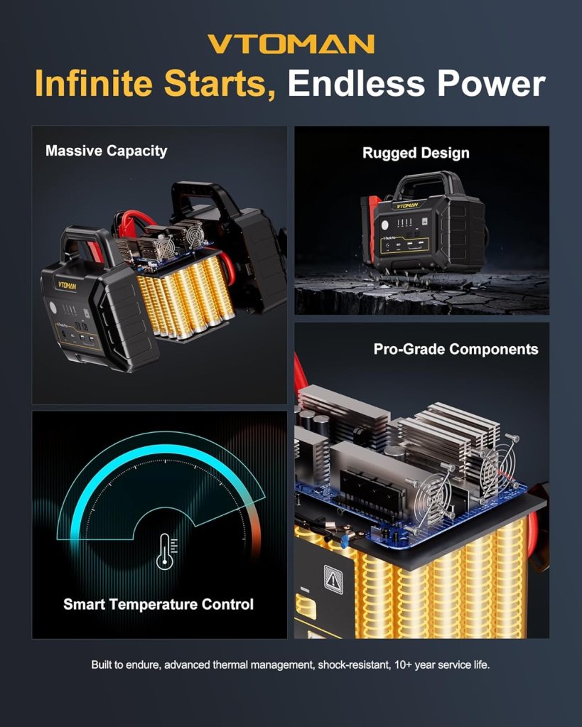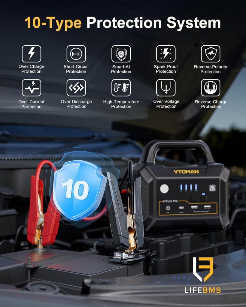 • Safe & User-Friendly – The V-Truck Pro jump starter power pack built with flame-retardant materials and 10-protection technologies (over-charge, over-current, etc.), it ensures safe use for everyone. Its rugged shell and high-performance battery operate reliably in extreme temperatures from -40°F to 140°F.No more waiting for roadside assistance in the cold wind