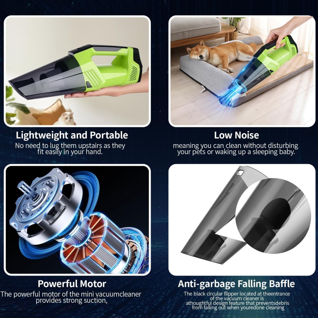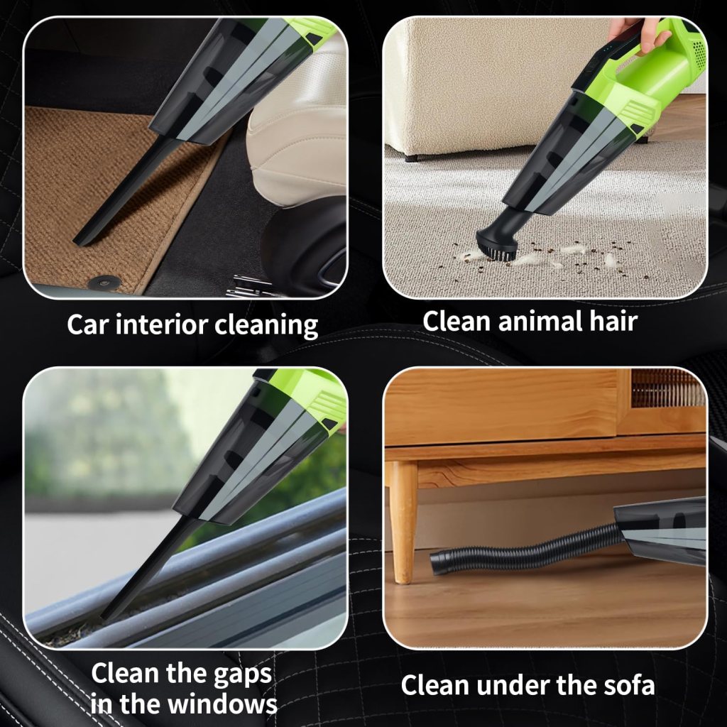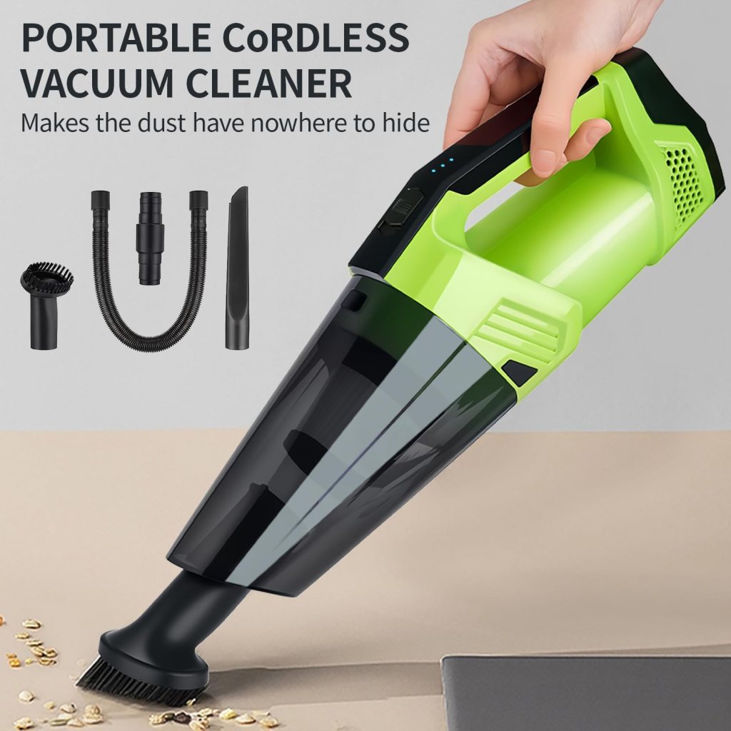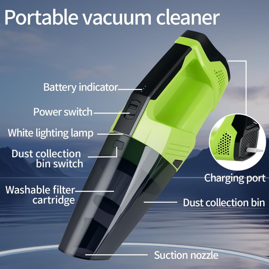 Cordless Car Vacuum: Portable Handheld Vacuum with LED Light, High Power Suction, Lightweight Rechargeable Hand Vacuum Cleaner for Car, Home, Office, and Pet Hair – Green