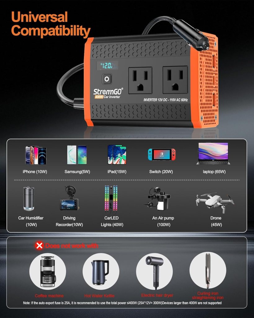 - What You Get: 400W Vehicle-mounted inverter, user manual *1, and industry-leading 1-year warranty, plus lifetime technical support