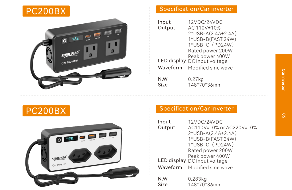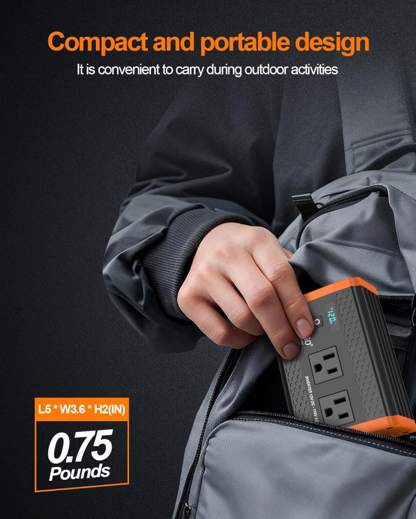 - Dual AC Outputs: This 12v Power inverters for vehicles Equipped with two AC outlet adapter and multiple USB ports, it can simultaneously power up to 5 devices like laptops, phones, and camping gear, making it ideal for road trips, remote work, and outdoor adventures